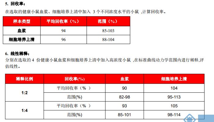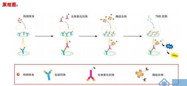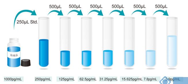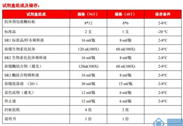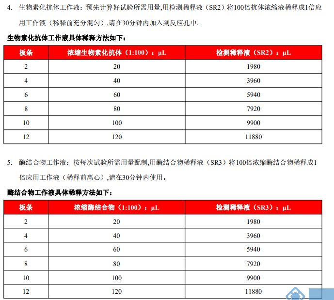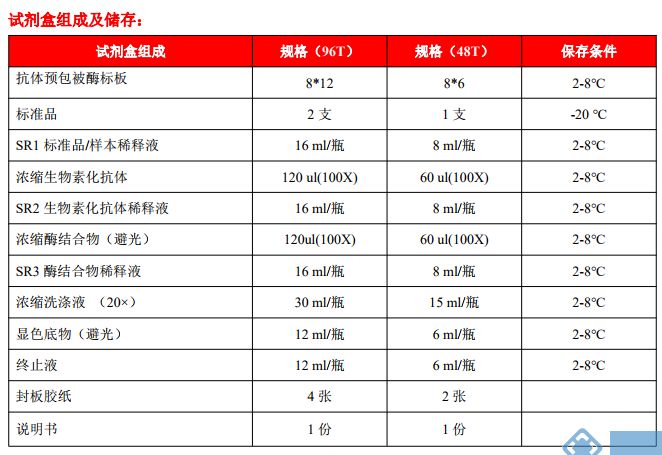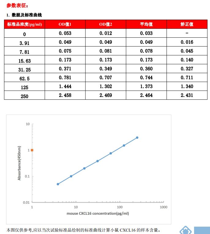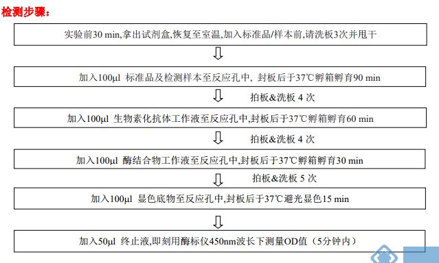 中文名称 小鼠CXC趋化因子配体16检测试剂盒 英文名称 Mouse CXCL16 ELISA KIT 反应性 Mouse 样品类型 Serum, plasma, Cell culture supernatant 灵敏度 8 pg/ml 检测目标 CXCL16 应用 Sandwich ELISA 背景介绍: 小鼠 cxc 16(Cxc Chemokine 16)是一种具有跨膜结构域的 CxC 趋化因子,cx3cl1/fratalkine 和 cxcl 16 是超家族中仅有的两种跨膜趋化因子,小鼠 CXCL16 cDNA 编码 246 氨基酸(AA)前体蛋白,推测 26 个 AA 残基信号肽,88 个 AA 残基趋化因子结构域,87 个 AA 残基粘样间隔区,22 个 AA 残基跨膜结构域,23 个 AA 残基胞质尾部。小鼠和人 cxcl 16 在趋化因子结构上有 49%的氨基酸同源性和 70%的相似性。小鼠 cxcl 16 是由淋巴器官 T 细胞区的树突状细胞和脾红髓细胞作为膜结合和可溶性形式产生的。根据 Northern 印迹分析,其主要在具有抗原提呈功能的细胞如树突状细胞、巨噬细胞中表达,也分布在肺、小肠和肾脏组织。检测原理: Solarbio (Solarbio ®) ELISA 试剂盒采用基于双抗体夹心法的酶联免疫吸附检测技术。将抗小鼠 CXCL16单克隆抗体包被在酶标板上;分别加入梯度稀释的标准品和预稀释的样本,标准品和样本中的小鼠 CXCL16会与酶标板上的包被抗体充分结合;洗板后加入生物素化抗小鼠 CXCL16 抗体,该抗体会与板子上包被抗体捕获的标准品和样本中的小鼠 CXCL16 发生特异性结合;洗板后加入辣根过氧化物酶(HRP)标记的链霉亲和素,生物素与链霉亲和素会发生高强度的非共价结合;洗板后加入显色剂底物 TMB,若反应孔中样品存在不同浓度的小鼠 CXCL16,则 HRP 会使无色 TMB 变成不同深浅(正相关)的蓝色物质,加入终止液后反应孔会变成黄色;最后,在λmax=450 nm(OD=450 nm)处测定反应孔样品吸光度(OD),样本中的小鼠浓度与OD 成正比,通过绘制标准曲线和四参数拟合软件便可计算出样本中小鼠的浓度。注意事项: 1. 试剂盒应在有效期内使用,请不要使用过期的试剂。 2. 试剂盒未使用时应保存在 2-8℃冰箱,已复溶但未用完的标准品,请丢弃。 3. 试剂盒使用前请在室温恢复 30 min,且充分混匀试剂盒里的各种成份及制备的样品。 4. 在试验中标准品和样本建议作复孔检测,且加入试剂的顺序应保持一致。 5. 为避免交叉污染,请在试验中使用 1 次性试管,枪头,封板膜(※)及洁净塑料容器。.6. 浓缩生物素化抗体和浓缩酶结合物的体积较少,在运输过程中微量液体会沾到管壁及瓶盖上,使用前请离心处理(5-10 S 即可),使管壁上的液体集中在管底部,取用时,请用移液器小心吹打几次。 8. 除了试剂盒中的浓缩洗涤液和终止液可以通用外,请不要使用其他来源试剂盒内含的试剂代替本试剂盒中的某单个组分。9. 为保证结果准确,每次检测均需做标准曲线。安全提示: 试剂盒中的终止液为酸性溶液,操作小鼠员在使用时请带上手套并注意防护;在操作过程中也要避免试剂接触皮肤和眼睛,如果不慎接触,请用大量清水清洗;检测血液样本及其它体液样本时,请按国家生物实验室安全防护有关管理规定执行。自备实验器材(不提供,可代购) 1. 酶标仪(主波长 450nm,参考波长 630nm) 2. 高精度移液器及一次性吸头:0.5-10,2-20,20-200,200-1000μl 3. 洗板机或洗瓶 4. 37℃孵育箱 5. 双蒸水,去离子水,量筒等 6. 稀释用聚丙烯试管 样本收集及储存: 1. 细胞培养上清: 将细胞培养基移至无菌离心管,在 4℃条件下 1000×g 离心 10 min,然后将上清等量分装于小 EP 管并于-20℃下保存(24 小时内检测可放入 2-8℃储存),避免反复冻融。 2. 血清样本: 室温血液自然凝固20 min后,在4℃条件下1000×g离心10 min,然后将上清等量分装于小EP管并于-20℃下保存(24 小时内检测可放入 2-8℃储存),保存过程中如有沉淀,请再次离心,避免反复冻融。 3. 血浆样本: 将全血收集到含抗血凝剂的管中,根据标本的实际要求选择 EDTA,柠檬酸钠或肝素作为抗凝剂,混合 20min,在 4℃条件下 1000×g 离心 10 min,然后将上清等量分装于小 EP 管并于-20℃下保存(24 小时内检测可放入 2-8℃储存),避免反复冻融。 ※注意:血清血浆样本避免使用溶血、高血脂样本,以免影响检测结果;如果样本中的靶标物检测浓度高于标准品的最高值,请将样品做适当倍数稀释后检测,建议正式实验前做预实验以确定稀释倍数。试剂准备: 1. 试剂回温:首先在实验前 30 min 将试剂盒,待测样本放置于室温下,浓缩洗涤液如出现结晶,请放入 37℃温浴直到结晶全部溶解。 2. 配制洗涤液:预先计算好稀释后的洗涤液使用体积,然后用双蒸水或去离子水将 20 倍浓缩洗涤液稀释成1 倍应用液,未用完的浓缩洗涤液放入 4℃冰箱保存。 3. 标准品梯度稀释:加入标准品/样本稀释液(SR1)1mL至冻干标准品中,静置15分钟待其完全溶解后轻轻混匀(浓度为1000pg/ml),按照以下浓度进行2倍稀释:250、125、62.5、31.25、15.63、7.81、3.91pg/ml进行稀释。250pg/ml作为标准曲线的最高点浓度,标准品/样本稀释液(SR1)作为标准曲线的零点(0pg/ml)。复溶过的标准品原液(1000pg/ml)未用完的应废弃或根据需要按照一次用量分装,并将其贮存在-20~-80℃冰箱,具体如下图。6. 洗涤方法: 自动洗板:甩尽酶标板孔中液体,在厚迭吸水纸上拍干,注入洗涤液为 300ul/孔,注与吸出间隔为 30 秒,洗板 5 次。 手工洗板:甩尽酶标板孔中液体,在厚迭吸水纸上拍干,用洗瓶加入洗涤液 300ul/孔,静止 30 秒后甩净酶标板孔中液体,在厚迭的吸水纸上拍干,洗板 5 次。结果判断:1.用酶标仪 450 nm 波长测定 OD 值。选择双波长检测,参考波长为 630 nm